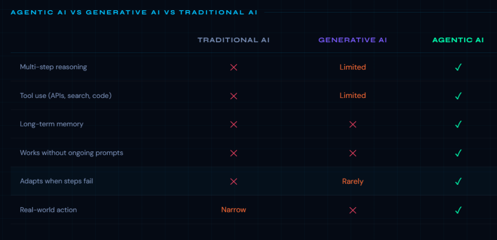 The word “agentic” comes from agency, which simply means the ability to act on your own. These systems do not just produce outputs when asked. They take initiative, use tools, track progress, and push toward an outcome.