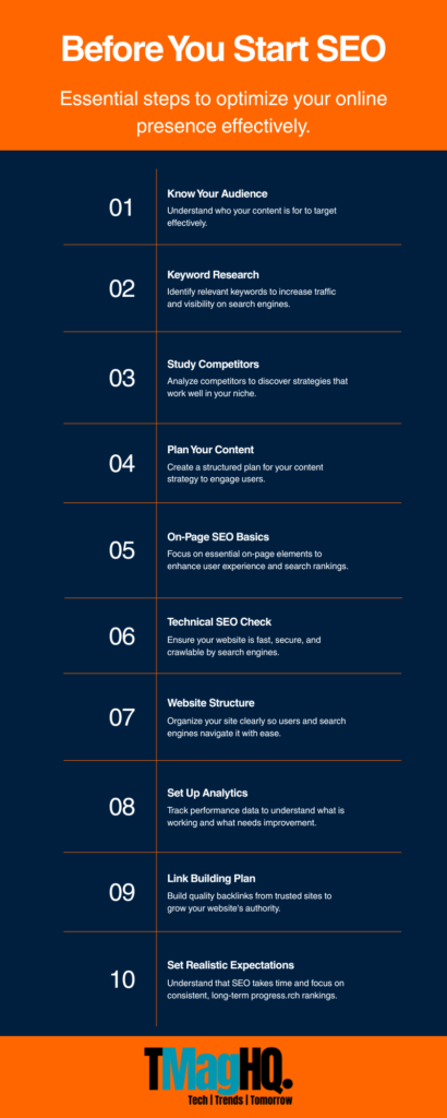 Before you start, go through this quick list. It covers the most important factors to consider before starting SEO and helps you stay on track.